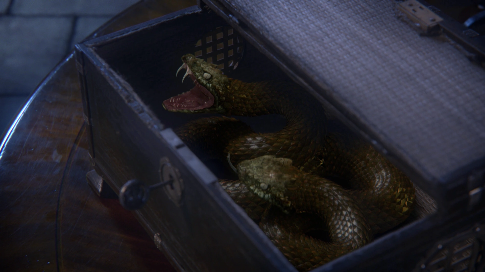 Жена короля Леопольда, Реджина, ухватилась за возможность убить своего мужа, когда она подружилась с Джинном из Аграбы, в которого она притворяется влюбленной. Затем она устраивает свое собственное заточение мужем, в которое ее отец Генри приходит, чтобы доставить коробку Джинну, умоляя его, что это единственная надежда его дочери на спасение. Получив коробку, Реджина открывает ее, чтобы показать гадюку из Аграбы внутри, прежде чем позволить существу убить ее, чтобы избежать своей судьбы в качестве пленницы. Джинн не дает ей довести дело до конца и вместо этого обещает убить короля, чтобы они могли быть вместе. Пока король спит, Джинн приносит шкатулку и открывает ее в ногах кровати. Гадюка отравляет короля одним укусом, и когда он умирает, Джинн печально объясняет, что он вечно благодарен за то, что король освободил его от лампы, чтобы он мог получить истинную любовь. Но джинн не сожалеет о том, что отдал Реджине зеркало и влюбился в нее, в чем он полностью признается, когда король делает свой последний вздох. Сразу после этого, Джинн, наконец, признает, что Реджина использовала его, чтобы заставить его избавиться от короля для нее. Поскольку гадюка также происходит с его Родины, убийство будет прослежено до него. («Плод ядовитого дерева»)