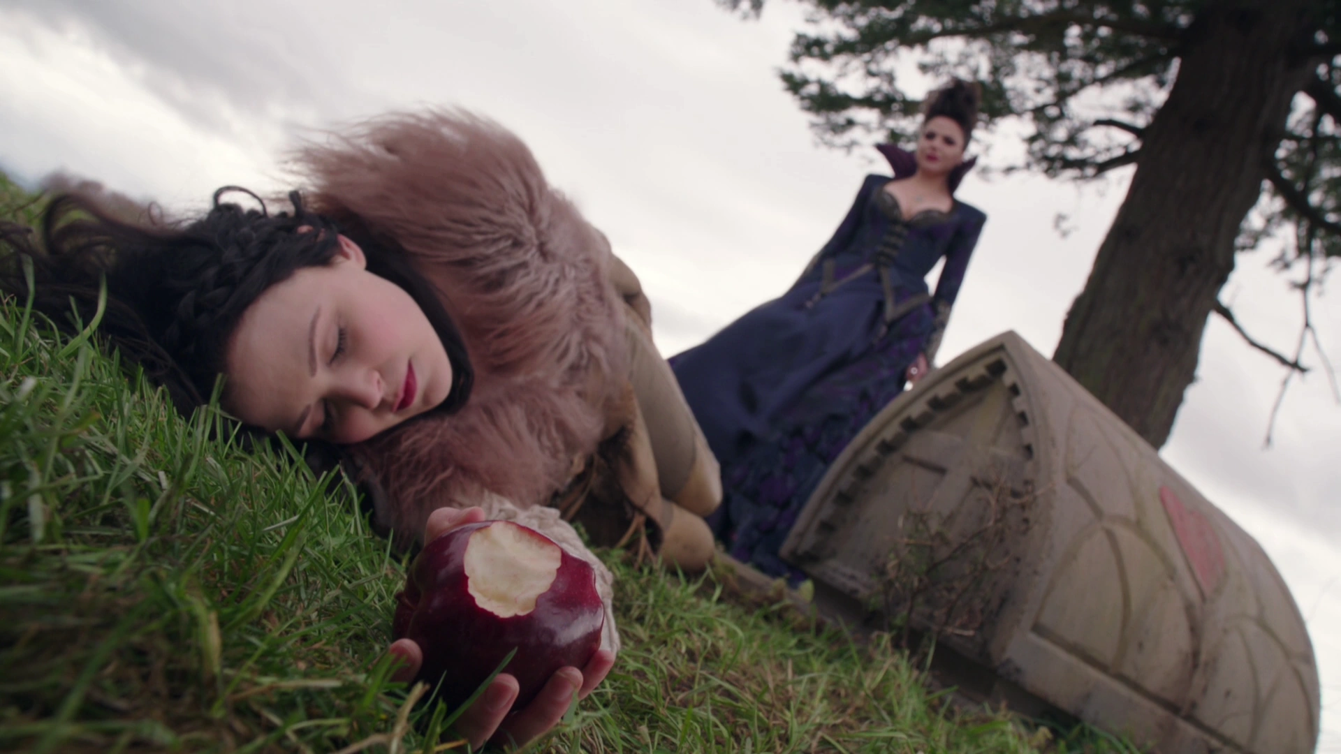 - Укусив отравленное яблоко, Белоснежка падает на землю также, как главная героиня сказки Диснея "Белоснежка и семь гномов" 1937 года.